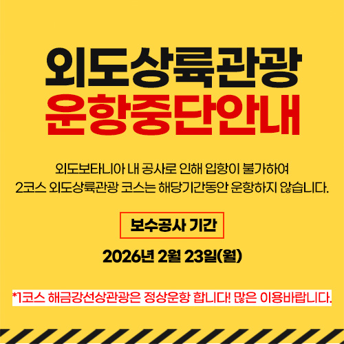 거제에 위치한 아름다운 섬 외도보타니아와 한려수도의 해금강, 십자동굴 등의 기암절경을 감상할 수 있는 외도 상륙관광 (2시간40분 코스)*외도입장료 유람선 매표소에서 별도구매
